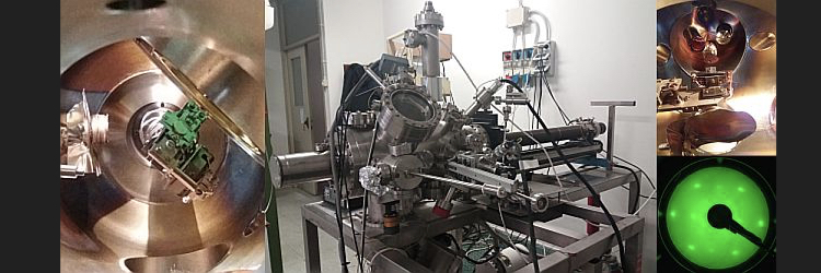 The UHV (Ultra High Vacuum) chamber hosts two multicell evaporators: both give the possibility to evaporate 3 different materials, one is a e-beam EPI evaporator for high temperature evaporants (for example metals such as Fe, Co, Ni, …), while the other one is for low temperature evaporants (below 500 °C, such as organic molecules). There is also a RHEED (Reflection High Energy Electron Diffraction) and a LEED (Low Energy Electron Diffraction) apparatus for checking the growth and the structure of the thin films. The LEED can operate also to perform AES (Auger Electron Spectroscopy) measurements to complement the structural studies with chemical information.
